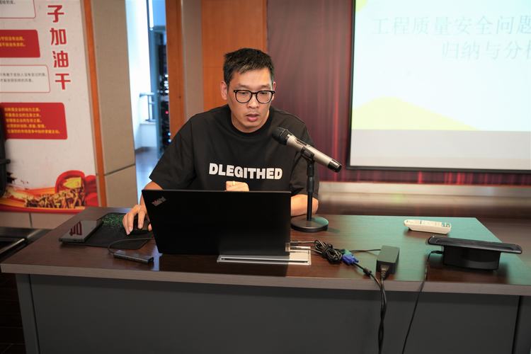 首先,由工程管控部陳振飛向大家歸納與分析了本次工程質(zhì)量安全大檢查中發(fā)現(xiàn)的問題。他通過市政、土建進(jìn)行項(xiàng)目分類,同時以圖文結(jié)合的形式對質(zhì)量、安全問題進(jìn)行舉例講解。