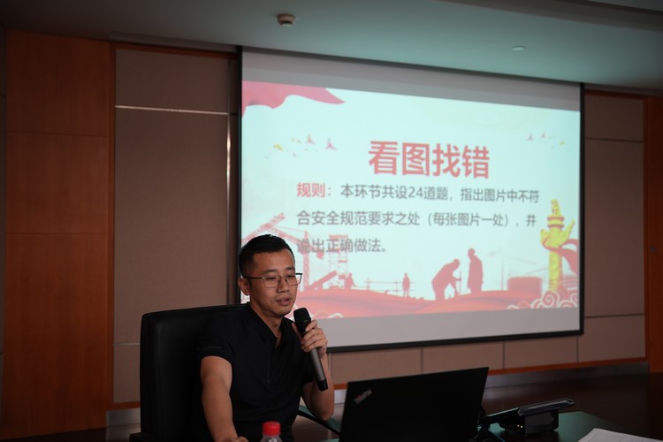 上半場(chǎng)個(gè)人賽,主持人隨機(jī)出題,參賽人員在規(guī)定時(shí)間內(nèi)完成作答,由專人統(tǒng)計(jì)成績(jī)。另設(shè)置附加題,以搶答的形式,指出圖片中的不符合安全管理規(guī)范之處,并說(shuō)出正確做法。